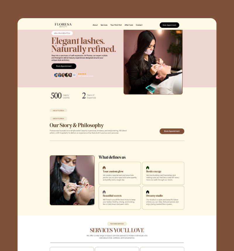 Floresa Beauty was brand new. No content. No system. Just Bri and a vision. We built the best lash website in Kansas, automated her bookings from day one, & created content people actually stopped to watch. She hit 50 bookings before launch.